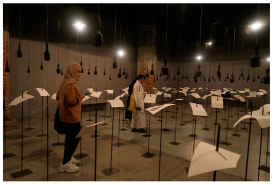 Shilpa Gupta’s, ‘For in your tongue I cannot fit’ (2017–2018), invites individual participation within a multi-point sound installation which addresses the violence of censorship. Described as a ‘symphony of recorded voices’, 100 speakers and microphones, speak or sing the words of 100 poets who have been imprisoned for their work, the corresponding verse printed on paper waiting to be read (Figure 5). Although not in the form of a book, this work draws the viewer in, towards a personal sensory experience of pages, reading and understanding.