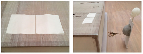 Continuing with ‘conversations’ from the principal national participating pavilions, the artist Cathy Wilkes, presents her ‘creations’ which ‘occupy’ the six rooms of the UK pavilion. As objects are placed around the entire space, from floor skirting level, to hanging from the ceiling, only a small number of visitors are allowed at any one time. There are two sets of folded pages laid out upon an ephemeral table’ like structure, presented at reading level height but blank, empty of what we might consider visual content (Figure 7).