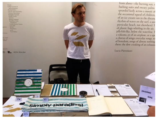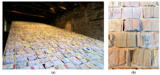 The same theme is explored in ‘Written by Water’ mixed media installation created by Marco Godinho for the Luxembourg Pavilion. This piece is composed of two back to back videos of the artist walking through the landscape, through cemeteries and along the seashore, whilst reading from and tearing the pages of a French translation of Homer’s ‘Belles-lettres’, the remainder of the book, its cover and tattered spine, visible through a narrow slit in the gallery wall. An adjacent gallery tells a narrative of refugees moving from South to North across the Mediterranean, most of whom have never encountered the sea, its enormity expressed in a third video, this time of exercise books that have been bathed in sea water, battered by the waves, presented on a slope, the roof of the pavilion, appearing to have been washed up like bodies, clothing or stories on the shore and left out to dry (Figure 10). In addition there is a text project which takes literally the idea of ‘conversations’, as explicitly talked about by Rugoff (2019)—a new text every day, for 100 days, printed onto a t-shirt and worn by the invigilator present at the exhibition who actively attempts to engage with the visiting public, to elicit reaction and dialogue relating to themes within the artwork.