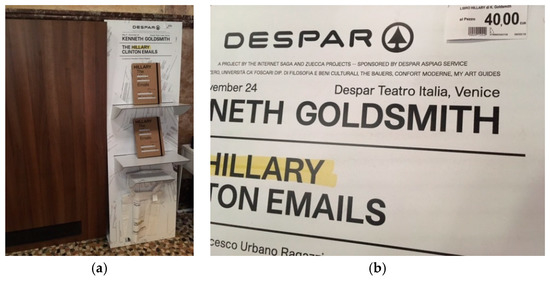 Hillary, The Hillary Clinton emails, is curated by Francesco Urbano Ragazzi, who chose Teatro Italia, a former theatre and cinema converted into a supermarket, for the exhibition. Ragazzi was excited by the idea of connecting commercial activity to art and culture in the context of daily life (Figure 19). For this installation, located on the old theatre’s balcony overlooking the rows of foodstuffs below, New York artist Kenneth Goldsmith presents 60,000 pages of Hillary Clinton’s email documentation in large white volumes, available for consultation, displayed in a room mimicking the oval office in the White House … knowing that some people would be enthusiastic, some not even noticing, … texts can also be found lining the top of the supermarket display units. Conveniently the accompanying publication is on sale at the supermarket checkout, beside the umbrella stand, an all-important reference to the modes of distribution applied by Ed Ruscha when marketing his seminal artists’ book, Twentysix Gasoline Stations, in 1963.9