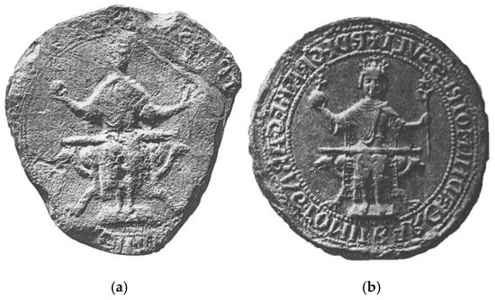 | 26 | For more on this hypothesis, see (). The king may have copied the sigillographic models of Federico II for his largest stamps. Subsequently, after adopting the imperial insignias, he transferred them to the iconography of his bulls. |