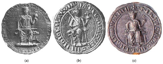 (a) Main seal of Jaime I, obverse. 1238–1276. From (). (b) Bull of James I, obverse. 1231–1238 (ibid., n. 25). (c) Bull of Jaime I. 1255. From (). All the seals show the preeminence of the sword in the seals of James I. Used with permission according with publishing rules in Spain.