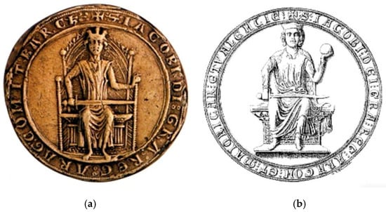 (a) Main seal of James I. Obverse. 1229. D/11222 © Archives Nationales de France. Legende says: + S:IACOBI:DI:GRA:REG:ARAG:COMIT:BARCH. (b) Main seal of James I. Obverse. 1248–1272. Legend says: + S:IACOBI:DEI:GRA:REG:ARAGON:ET MAIORICAR:ET VAENCIE. Design taken from (). Used with permission according with publishing rules in Spain.