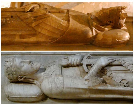 Monastery of Santa María de Poblet. James I as king and as monk, recumbent effigies which show the concept of Rex et Sacerdos. They were commissioned by Peter IV in the second half of the 14th century and restored in the 20th Century: the darkest parts are original; the lighter parts are reconstruction by the sculptor Frederic Marès. © Santa María de Poblet. Photo: Marta Serrano Coll. Permission granted.