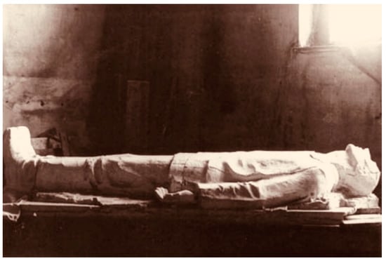 Käthe Kollwitz, Reclining Dead Soldier (Peter Kollwitz), 1915/16. Plaster, dimensions unknown, (presumed lifesize), lost. Model for a three-figure memorial (not completed). Photograph, Landesarchiv, Berlin. Photographer unknown.