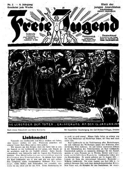 Under this title the Socialist Workers’ Youth, West Saxony District, publishes an excellent small publication. It is so important and so valuable to us pacifists because it expresses the determination, the unconditionality and the will to act of those who are most important, the masses of youths who would be the army in the next war. […] This colourful muddle of visual arts, poetry, politics and science, which stand side by side here, becomes the most wonderful coexistence of various forms of expression for equal paths, for equal will. In addition to pictures by Käthe Kollwitz, Dix, George Groß, Masereel, there are words by Toller, Eisner, Engelke. The eternally young, Karl Liebknecht and Rosa Luxemburg, again have their say in this book of youth. […] This manifesto should be available to all those who want to learn from a truly young, antimilitarist fighting spirit.