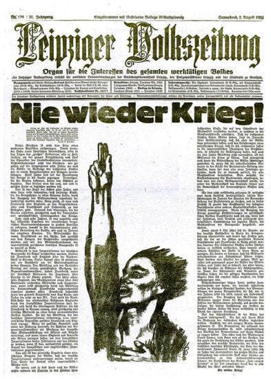| 2 | The German Nie wieder Krieg [No More War] movement (not to be confused with the British No More War Movement (NMWM), founded 1921) existed from the beginning of World War I, growing to much greater numbers by 1920, the first year that the major annual demonstrations were held in various German cities on the anniversary of the outbreak of World War I (1 August 1914), and which would continue in force until 1925, when numbers had already begun to wane. By 1921, more than twenty antiwar organisations had been formed in Germany as part of the Nie wieder Krieg movement. See for example (Bader 1979). For insight into postwar German politics and society in relation to war commemoration, see for example (Ziemann 2013). |