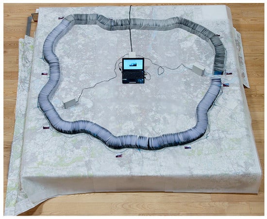 Moving anti-clockwise, I began my journey following the direction and sound of traffic, keeping as close to the edge of the boundary as I could. I was dressed from head to foot in light but durable clothing that would not only protect me from all weathers but would also enable me to move through the variations in landscape and terrain that I would encounter en route. I knew that, as well as running on undefined territory, I would have to climb, jump, and squeeze myself through different spaces to make my own path. A small rucksack on my back held just enough for one change of clothing, a small notebook computer, spare batteries and chargers, a flask of high glucose fluid, some powder sachets, and some energy bars, enough to last me the nine days of the journey. Strapped to my head and body were a number of media devices that were not only recording the activity as I ran, but were also sending data approximately every 30 s to an Internet database in the form of a photographic image and GPS coordinates.