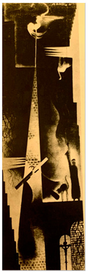 One of Ardon’s early works reveals the influence of Jewish diasporic imagery. Narrated through a Zionist prism, biographies of the artist suggest that it was only upon arriving in Palestine that he became a “Jewish artist,” that is, found his modern Jewish identity and expressed it artistically. In this Zionist hagiography, he is portrayed as a Jewish–Zionist artist who reconnected with his Jewish roots. Zion is presented as the only possible site in which this “reunion” might take place. Ardon’s Zionism only further burnished his reputation as a Western and modern artist who had trained among the great German expressionists. But records of his early work tell another story: Judaism had been present in his work from the very beginning, irrespective of his migration to Palestine. In Steeple at Midnight (Figure 1) from 1920, the work that reputedly secured his admission into the Bauhaus Academy, Ardon combined the Jewish kabbalistic myth and tradition of Tikun Chatzot (Midnight Rectification) with recollections of his childhood in a traditional Jewish shtetl. The crayon drawing is rendered in a cubist and surrealist style. It portrays a crowing cock, cats wandering at night, the crucified figure of Jesus, and a mysterious, probably Jewish, man. These visual motifs are significant in Jewish iconography. What is more, the choice to set the scene at midnight resonates with Ardon’s wider life story—indeed, midnight is mentioned twice in his early biography entries in latest catalogue of his work (Ardon Ish-Shalom 2019, pp. 10–13). This might reflect the artist’s experience as a devout young Jew in Poland, where he would wake to pray at this hour. In the work, then, Ardon has conveyed the Jewish experience through art.
