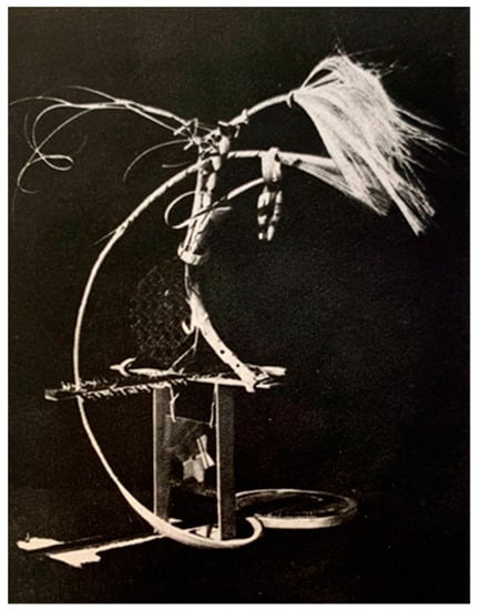 Materiesstudie from 1921 (Figure 2) is another striking example. For a student assignment at the Bauhaus, Ardon was asked to explore the nature of materials and relations among them by creating a three-dimensional composition. Besides materials, such as nylon and industrialized straws, he also chose to study traditional Jewish symbols, such as the palm branch (the Lulav, one of the four species of plants mentioned in the Torah), the Star of David, a key, a watch, and “all sort of things I brought from home”, as the artist recollected (Ardon Ish-Shalom 2019, p. 14; Vishny 1974, p. 16). Here, Jewish symbolism, derived from the artist’s own cultural experience, overlaps with modern German expressionism without Zionist sentiment. Might these two examples be read as artistic renditions of diasporic imagery? To what extent was this imagery derived from his complex diasporic identity as a modern, socialist, and secular Jew with a traditional religious background, striving to belong to modern Germany without abandoning his culture? Why has this early imagery been overlooked in favor of his later Zionist works? The historiographical neglect of this early diasporic voice in Ardon’s work—which, though Jewish, was resolutely pre-Zionist—is unsurprising. Indeed, it figures just one specific instance of a silence that runs throughout the canon and history of modern Israeli art, both of which were deeply affected by modern nationalism. The absence is that of the Jewish voice.