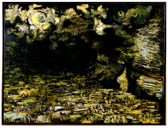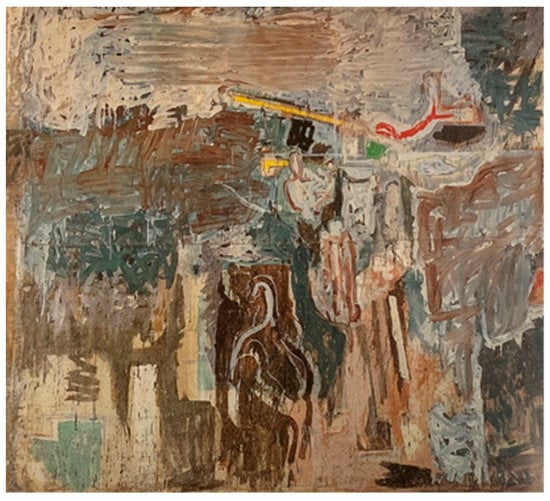Joseph Zaritsky’s painting Yechiam (Kibbutz Life), 1951 (Figure 4) is an excellent example of the kind of French-influenced abstract art style that was canonized in this period. This work is the culmination, rendered in oil, of a series of watercolor drawings that Zaritsky had made in Kibbutz Yechiam between 1948 and 1951. Whereas his early watercolors depict Kibbutz life in a semi-figurative manner, this oil painting is almost entirely abstract. Although it stemmed from a desire to represent the new Zionist and socialist ideology of the Kibbutz, the work responds to the formalist idea of “art for art’s sake” (Zalmona 2010, pp. 179–80). This series of Zaritsky’s works was exhibited in the first shows of the New Horizons group in Tel Aviv. Accounts of the New Horizons’ artistic practice emphasizes the French expressionist origins of its style as well as its goal of establishing abstraction in Israeli art (Ballas 2014, pp. 12–14).