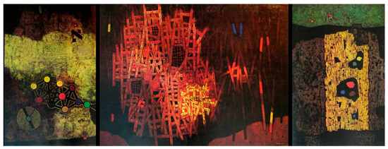 Whatever his early political engagements, Ardon’s life was always intertwined with art. In Galicia, he was influenced by Jewish religious paintings. In Germany, he studied at the Bauhaus Academy in Weimar, where he proved a promising student, inspired by the “great masters” of German expressionism: Johannes Itten, Paul Klee, Wassily Kandinsky, and Lyonel Feininger. Given that he was simultaneously active in politics, most of his art was engaged with the relations between art and society. After fourteen years balancing his membership of the Jewish Socialist Party and fledgling artistic ambitions, he was forced to flee Nazi Germany for Palestine in 1933, Palestine being his last resort (Vishny 1974, pp. 15–23). Although Zionism was far from the young immigrant’s mind at this stage, records of the artist in Israeli art history center on this aspect of his life in Palestine. He is described as undergoing an almost mystical conversion to Zionism. In 1950, he eventually took the name Mordecai Ardon (Ardon being the biblical name), thereby completing his transformation, first from Osterjuden to German Jew, and then from German Jew to Israeli.8