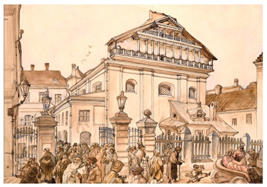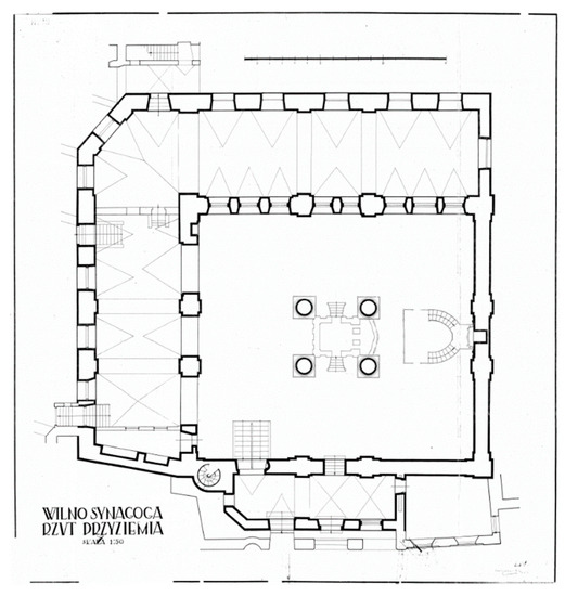 The first wooden Great Synagogue of Vilna was erected, probably in 1573, after the Jews of the city received privilege from Sigismund III Vasa, the united monarch of the Polish-Lithuanian Commonwealth (Klausner 1935, pp. 5–6). Further privilege was granted in 1633 by Władysław IV to build a masonry synagogue (Figure 1). As the architecture of this new synagogue has been detailed by Levin (2012, pp. 284–93), a background summary is all that is required here. Constructed in Baroque style, the Great Synagogue (Figure 2) was a large, almost square building (22 m × 25 m; 22.5 m high), the floor of which was located nearly two metres, or ten steps, below street level to give the interior a lofty appearance while complying with the height restrictions of the building imposed on the community by the authorities (Klausner 1935, p. 9). Pilasters divided all four façades into three bays each corresponding to the interior arrangement of the building. The central bay of the south-eastern façade, marking the interior placement of the Torah ark, was narrower than the side bays. The prayer hall of the Great Synagogue featured four centrally placed, 8.5-m-high Tuscan columns that reached the spring of the vault, while the perimeter of the prayer hall was spanned by eight additional bays with twelve lunettes above the lower segment-headed windows.