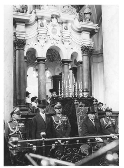 President Ignacy Mościcki of Poland seated in front of the bimah in 1930. Photo: National Digital Archives of Poland, www.szukajwarchiwach.gov.pl/jednostka/-/jednostka/5965807/obiekty/367856#opis_obiektu. Public domain image.