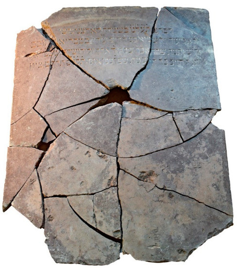 The inscribed slab after the pieces were assembled. Photo: Jon Seligman, Israel Antiquities Authority.