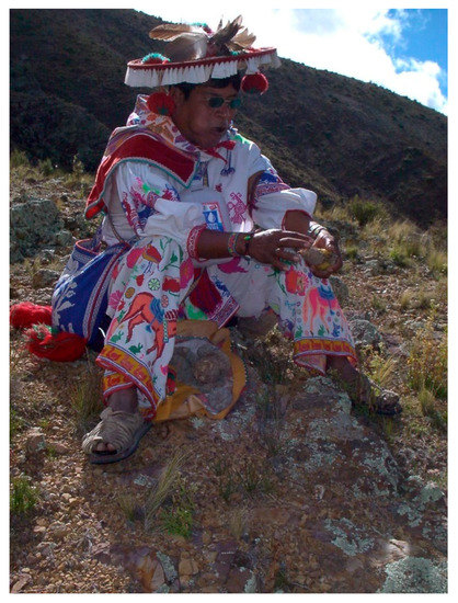 Medicine and science have historically been intertwined; Lutyens was drawn to shamanic healing practices as early as age seventeen in the Amazon rainforest of Ecuador and explored it more closely after his twenties, with special interest in those of the Huichol, originally known as the Wixarika, a tribe in the Western Sierra Madre of Mexico. The healing process they use involves the application of medicinal plants (Valdivia-Correa et al. 2016) as well as the hallucinogenic cactus, peyote (Lophophora Williamsii), for psycho-spiritual rituals. Figure 1 shows a Huichol Shaman conducting a healing ritual for participants in a pilgrimage to the mountains of the Western Sierra Madre, Mexico. What stood out to Lutyens was how in these traditions, unlike in Western/European medicine, the body, the mind, and the spirit were all considered to be linked and extended seamlessly into nature. This contains, in its intuitive way, the notion that healing needs a strong psycho-somatic basis and that one cannot rely solely on surgery and pharmaceutical drugs to heal. Furthermore, in the West, the ancient role of the shaman has been divided into three practices: (a) the doctor, who looks after the body as a bio-mechanical object, (b) the priest, who looks after the spirit, often in the context of a political matrix, and (c) the artist, who is often relegated to a kind of creative decorator (La Barre 1979, p. 7). However, recently the idea of integrating psychedelics back into medicine has been gaining traction, particularly in the cases of PTSD or hospice care, and has attracted mainstream attention through the growth of the wellness industry and, most recently, through the bestselling book How to Change Your Mind by Michael Pollan (2018).