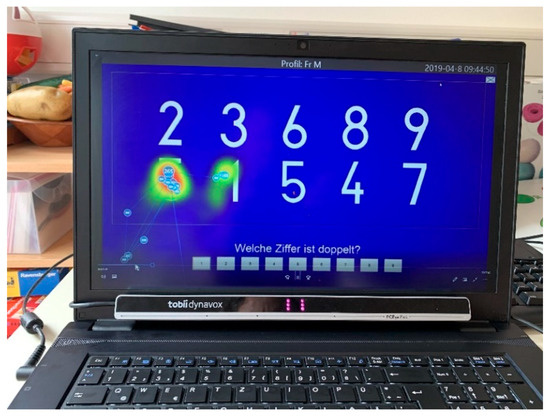 The bar between the keyboard and the screen is an eye tracking device, which helps the therapist understand where the patient is looking. In this case the patient is being encouraged to look at all the numbers including the ones to the right, neglected side of the screen, although in the image the patient’s eyes are drawn to the bottom left two numbers.