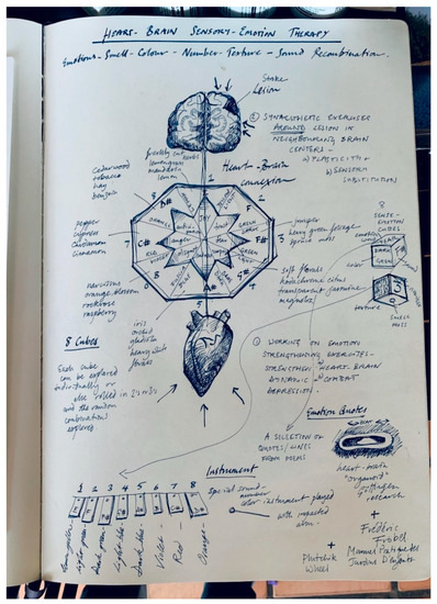 Impressively, participants drew with fluidity—many people drew with both hands at the same time, regardless of which one was supposedly dominant, each hand appearing to express a different emotion. Lutyens hoped that this “artistic therapy” would reconnect different centers of the brain, under siege by constant electronic distractions and overspecialization at work (Cytowic 2019). It is important to note that this project was not conducted in a medical or hospital context with brain monitoring devices, but nevertheless, following the cues of Hans Asperger’s approach, it used a process of interaction with the visitors to learn of possible cues for stimulating the mind in unexpected ways. Many visitors to the performance reported that they had been in some way “transformed”, while others experienced moving moments of catharsis accompanied by uncontrollable tears, as though some mental blockage had been removed from one or both of the brain hemispheres.