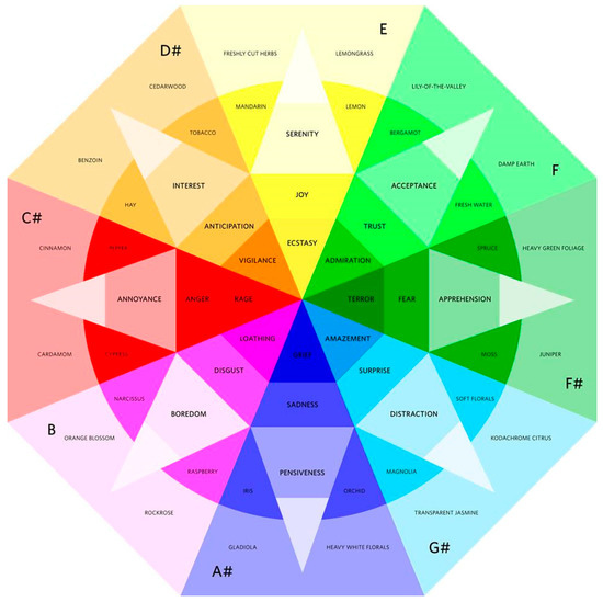 In the clinical context of stroke treatments, Lutyens envisioned a protocol that provokes synesthesia for therapeutic ends. This approach built on a previous work by Lutyens titled Memory Observatory, in which colors, smells, images, sounds, and words were orchestrated to recreate old memories and stimulate new collective ones. The correspondences between different sensory modalities were achieved through an augmentation of the Plutchik Wheel (Pico 2016), which maps a relationship between certain colors and certain emotions. Lutyens expanded these two correspondences to include smell and sound (Figure 13). The correspondences between color, smell, and emotions were worked out with the expertise of perfumer Stephen V. Dowthwaite and are derived from the Fragrance Wheel, which was first developed by Austrian perfumer Paul Jellinek in 1949 (Jellinek 1949; Barwich 2017). The sound to color and emotions relationships were worked out with film sound designer Julia Owen. These were based on prevailing film sound design theory in which major keys are considered to be bright and associated with happiness, whereas minor keys are emotionally darker, as well as more rigorous psychological studies related to color, emotions, and sound by PerMagnus Lindborg and Andres K. Friberg (Lindbrog and Friberg 2015).