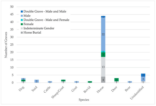 Zooarchaeological remains are most common in graves from sites near Magdalenska gora, Stična, and Libna. Most of these sites were excavated at least partially in the late 19th and early 20th centuries, which makes it difficult to assess the minimum number of individuals (MNI) for each context (Gabrovec 2006; Gabrovec and Teržan [2008] 2010; Guštin 1976; Hencken 1978; Tecco Hvala et al. 2004; Tecco Hvala 2012; Wells 1981). Probable male1 graves are most commonly associated with zooarchaeological remains and are more likely to have remains of multiple animals in a grave (Figure 2). There are only eight probable female graves associated with faunal remains, though there are also 17 indeterminate graves with faunal remains that cannot be gendered according to the parameters of this study. The four horse graves contained solely horses, without associated human remains. There are no children’s graves with faunal remains.