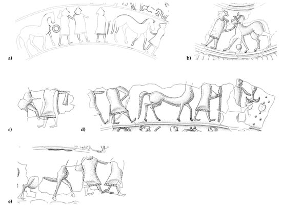 Men carrying axes, leading or following animals, are depicted on five objects (Figure 1 and Figure 6). On four of these objects, the animal is a horse (Figure 1, top; Figure 6a,b,d), on one there is a sheep (Figure 1, top), and on another, an ibex3 and a red deer are recognizable, but the other ungulates cannot be taxonomically defined (Figure 1, bottom). Ungulates whose species cannot be determined appear on three of the five objects (Figure 1, bottom; Figure 6a,c,e).