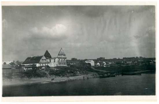 The pyramidal volume of wooden synagogues, high roofs, wings and small towers of various forms, balconies, and colonnades attracted travellers’ attention. From 1871 onwards, archaeologist and ethnographer Zygmunt Gloger (1845–1910) travelled on the River Nemunas from Grodno to Kaunas on several occasions collecting ethnographic material, exploring the banks of the river and the views of the townships settled there. In 1903, he published his notes (Gloger 1903). In his notes of 1899, Gloger mentions the Jurbarkas Synagogue: ‘Those who come to Jurbarkas by the River Neman see from a distance not a church protruding from behind houses and trees, but rather the famous old wooden synagogue rising above the roofs of the town. As it was before sunset, we immediately went to take a photo of this remarkable ancient wooden architectural monument. The synagogues of Lithuania and Russia were peculiar already in the previous centuries: tall, ornate with porches and canopies supported by carved columns. There were a dozen such synagogues that survived from the 17th and 18th centuries. The most famous of them were in Jurbarkas, Zabludov, Volpa, and Pohrebyshche. Such houses of God used to exist in all the most populous towns inhabited by Jews, but time and fire destroyed hundreds of them. And the ones that still exist have not always been photographed. Therefore, it would be highly desirable for people of good will to draw them by depicting every detail or to photograph all Lithuanian synagogues’ (Gliogeris 1992, p. 112).