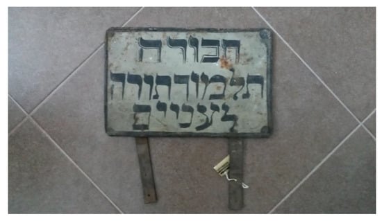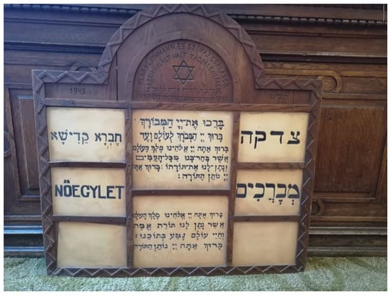 The shnoder-sign in the Status Quo Ante synagogue of Debrecen (1910) has an ornate metal arch with a sign in the middle with the blessings, and underneath the blessings is a metal frame with nine slots and separate plaques in each slot with various possible beneficiaries. The plaques visible now are in Hebrew and/or Hungarian. They have been made in various designs, which suggests that they were not made at the same time. The plaque for the Ḥevra Kadisha is different from the others. It is the only permanent, metal plaque—which corresponds to the permanent, established right of the association to collect funds in the synagogue “in the course of Torah reading and the Misheberakh” (). The other plaques offer associations or specific events and goals, such as “High Holiday expenses” (Figure 8).