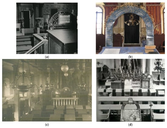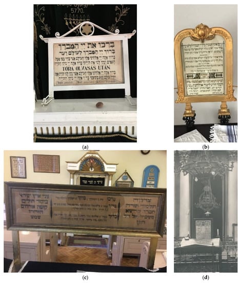 Examples of shnoder-signs in the form of an arch. (a) Kiskunfélegyháza, Orthodox synagogue, 1962 (Hungarian Jewish Museum and Archives, inv. no. F66.184), (b) Baia Mare, today Romania (photo by the authors, 2016), (c) Synagogue in Orczy House, Budapest, ca. 1910 (Hungarian Orthodox Israelite Archives and Library), (d) Csongrád (Hungarian Jewish Museum and Archives, inv. no. 70.97). Used with permissions.