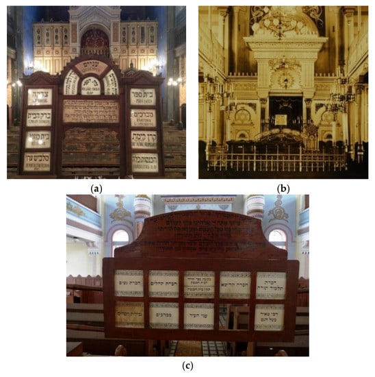 Examples of interchangeable signs. (a) Miskolc Kazinczy street (photo by the authors, 2016), (b) Orthodox synagogue, Prešov, today Slovakia (Jewish Museum in Prešov, Austerlitz’s Album), (c) Nyíregyháza (photo by Péter Somos, 2017). Used with permissions.