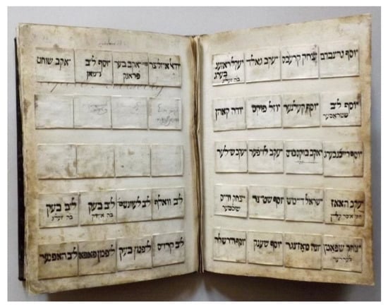 | 46 | For traditional uses of this technique, see Jewish Museum in Prague. Rychnov nad Kněžnou, JMP.COLL/P2017/0110. Available online: collections.jewishmuseum.cz/index.php/Detail/Object/Show/object_id/442133# (accessed on 1 December 2019), and Amsterdam, Jewish Historical Museum, no. MB00724—in the book, every member has a special page, and their donation is marked by folding the corner of that prayer. Moreover, another interviewee mentions this technique witnessed in the interwar period in Hungary, but not for recording donations, but for making a list of secondary school attending boys absent from the Saturday prayer by the dayyan (). |