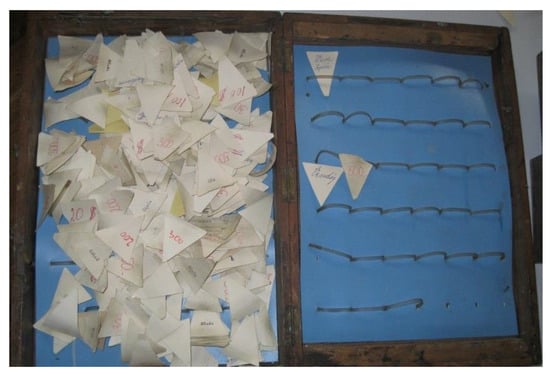 There are two further such boxes in the orthodox community in Budapest on Kazinczy street: In the winter synagogue and in the Shas Ḥevra prayer room. In the winter synagogue, after World War II they used a shnoder-book with an alphabetical register, with nine names on each page and two small slots below each name. To accompany this, there are small triangular slips of paper in a separate wooden box. These papers show possible amounts, occasions, and beneficiaries of the donations. These small triangular slips of paper were slipped in the slots under the names to record the donations. The book and the box are still in the collection of the community, though no longer in use. The box of the Shas Ḥevra prayer room was used on its own, without any book: The box had little slips of paper with names, sums, and the order of donations (e.g., third, sixth), and the charity donations were registered by grouping these slips of paper together () (Figure 13). The slips of paper with the order of people called up to the Torah—just as in the case of the shnoder-book of Debrecen—indicate that this item was used for auctioning or selling the honors, and not for spontaneous donations.