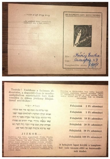 As already seen, the shnoder-signs lost their function soon after the Holocaust. In Hungary, the size of the surviving communities, as well as the change in social and political structures, especially after the Communist takeover in 1948–1949, led to the change of the customs, the dynamics, and purposes of charitable donations. As part of this process, the exogram techniques changed as well.45 One of the methods that became common in Hungarian communities in the mid-twentieth century was to print uniform slips of paper for shnoder-donations, with various sums on it, with cuts in it between the sums. The benefactor then had to fold in the sum he wanted to donate (Figure 15).46 These were mass-printed slips of paper, single-use only. In Debrecen, they were mailed to the congregants before mazkir (the memorial services on certain holidays), probably also to urge attendance. They then had to bring the slips of paper with them to the synagogue.47 We have data on the use of similar slips from Budapest and Jánoshalma as well.48 Another parallel custom was for the congregants to write their names and the donation details onto slips of paper, and hand it over to those in charge during the Torah service. This custom had its halakhic problems: The slips of paper would have to be written by the congregants before the Shabbat or the holiday, and there were difficulties also regarding the carrying of these slips of paper to the synagogue—accordingly, this custom was more typical in communities where religious observance was more lax. In any case, these slips of paper were even more ephemeral than any of the previous solutions to recording charitable donations, and they hardly had any chance to survive.