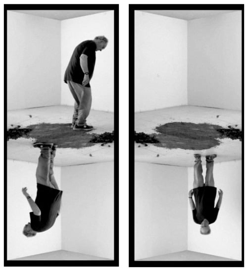 Ullman and Sharabani first met in 2014 during the mounting of an exhibition at the Umm al-Fahm art gallery.3 Sharabani documented Ullman on his quest for different types of earth and in his efforts to prepare the earth for his installation. He also documented on video a strikingly frank, and politically charged, conversation between Ullman and Said Abu Shakra,4 touching on histories of displacement and return, the complexities of national identity, and ownership over the land—the core conflictual issues underlying the extremely uneasy coexistence of Jews and Arabs in Israel. The encounter between Sharabani and Ullman at the Umm al-Fahm art gallery is reflected in Sharabani’s video, Card (2014; Figure 4), a video work depicting Ullman in the process of preparing earth for his installation at the gallery. Ullman seems absorbed in a strange ritual dance, which he performs to the grating sound of earth-crumbs cracking under the pressure of his feet. Sharabani duplicated and flipped the video image, producing a disorienting spatial ambiguity that recalls the architectural conundrums of Giovanni Piranesi (1720–1778) or M.C. Escher (1898–1972). Note that Ullmann is positioned simultaneously atop and beneath a floating layer of earth, despite the obvious fact that the gallery floor can only be seen from above. Sharabani heightened this effect of disorientation through a series of spatiotemporal and acoustic disruptions. The video opens with a view of an empty gallery space, save for three mounds of soil piled on the impossibly suspended floor. A sound of grinding, issuing from an invisible source, precedes Ullman’s entry by ten long seconds. An additional nineteen seconds elapse before the activity that actually explains the grinding sound begins. In fact, in this fifty-seven-second video, sound and image are never played congruently. Over its entire duration, Card is unsettlingly dissonant. The paradoxical spatiality of the video culminates when Ullman enters the space upside down, as it were (Figure 4, right), a whole second before his upright mirror-self walks in. What is more, Ullman’s movements are not in synch with those of his flipped doppelgänger. Indeed, the video ends with the “upright Ullman” leaving the space while his double lingers behind. Here, it is productive to recall Mieke Bal’s attribution of heterochrony—the experience of time “as multiple [and] heterogeneous” ()—to the aesthetics of “the social phenomenon of the movement of people” (p. 212). Miguel Hernández-Navarro, who collaborated with Bal on the video-art exhibition 2MOVE: Double Movement/Migratory Aesthetics (2008), suggested that migratory experience unfolds within a “temporal space which is not Euclidian, but rather möbian” (). In light of Hernández-Navarro and Bal’s concept, Sharabani’s uncanny flipped cell might qualify as a spatiotemporal Möbius strip, a disorienting space-time conundrum that taps into the uncertain status of ground in migratory existence.