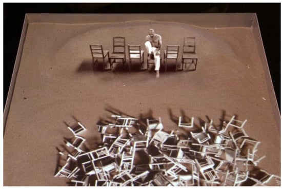 Sand tables, which consist of iron or steel boxes filled with sand or heavier red earth (Hamra), form the primary point of intersection between Ullman’s and Sharabani’s bodies of work. Sharabani’s installation Sand Box (2014; see Figure 3) features minuscule virtual chairs projected onto a non-virtual sand table. In perfectly simulated movement, a pile of virtual chairs accumulates before collapsing into the sandy surface. The objects gradually submerge, as if in quicksand, only to reemerge seconds later in an eerie resurrection. All the while, at the extremes of the projection frame two human figures are each positioned uneasily on a row of chairs, attempting to place themselves impossibly across several chairs (Figure 5). Their visible muscular unease recalls Mieke ’s () assertion that “[migratory] experience, in addition to having to be historicized, needs to be kinetico-visualized”. Sharabani brings together moving image and actual, material sand, the latter functioning as a highly textured projection screen inviting tactile engagement. As such, the work has not only an augmented haptic appeal (), but the “synesthetic fullness” () and “sentient binding” (ibid., p. 26) that Bal highlights as key traits of migratory aesthetics.