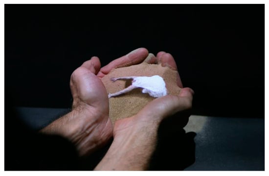 This may be the point to bring in Bennett’s proposition with regard to the “transactive” character of trauma-related art. Assuming a phenomenological rather than hermeneutic viewpoint, I propose that the grainy materiality of sand endows these works with a distinctly sensual appeal which relies on their tactile or haptic suggestiveness. While these works address the unreliability of ground and signal displacement in myriad ways, still, a specifically phenomenological inquiry is prone to disclose a compensatory presence effect, approachable in the terms proposed by Hans U. (). On Gumbrecht’s account, this means that the installations under scrutiny tap into “a layer in our existence that simply wants the things of the world close to our skin” (ibid., p. 106), thus reaffirming our presence or emplacement in a material body, if only fleetingly.5 Significantly in this respect, visitors to Sharabani’s installations are hard put to distinguish between the virtual objects projected onto the sand and the concrete materiality of the medium itself. The surfaces and mounds of sand in both Ullman’s and Sharabani’s work induce a strong desire to sink one’s fingers in them or scoop up a handful. In fact, visitors to Sharabani’s exhibits have been caught attempting to manually capture the virtual objects, complete with the supporting sand (Figure 10). This would suggest that the interfacing of sand and digital media fosters somatosensory arousal and cognitive dissonance. An augmented sense of bodily presence therefore seems crucial to the experience afforded by the installation. Ullman’s installations, too, incite viewers to tactile engagement with massive bodies of rust and sand, with the haptically suggestive sand tables and the deep pits in the ground, which I shall discuss presently. In addition, I propose that Ullman’s carefully balanced mounds of earth induce a similar bodily tension as that displayed by the human figures in Sharabani’s Sandbox.
