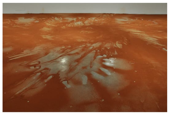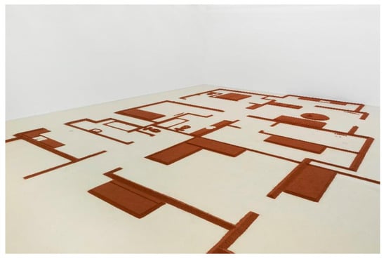 Some of Ullman’s later installations spatialize existential transience at a scale suited to gallery exhibition. In Sanday, performed in 1997, the artist moved the contents of his home into an art gallery in Tel Aviv. The Hebrew title, Yom Hol, plays on the double meaning of “weekday” and “sand day.” Spraying thinly sieved red soil over the objects before removing them carefully, he created an ephemeral sand map of his family home. A similar gesture can be found in the site-specific installation Wedding (Figure 12), which featured centrally in the artist’s retrospective exhibition Sands of Time (2011) at the Israel Museum. A performative “wedding,” the installation entailed the exhibition curators and volunteers acting out a Jewish matrimonial ceremony. The artist sprayed a thin shower of Hamra soil over the entire scene, participants included. Ullman defined his own part as that of a “photographer,” recording in sand the imprint of a cryptic event that seemed to have been disrupted, perhaps violently. Finally, in the installation Semidetached (2018; Figure 13), Ullman returned to the trope of the home, tracing the floor plans of his family residence and the adjacent neighbors’ semi-detached home in thin berms of red Hamra. Re-scaling the house to fit the gallery space, the artist included the contours of home amenities, such as showers, wash basins, and bathrooms, among which visitors were invited to meander. The extreme fragility of the installation required weekly maintenance, which the artist undertook himself with the help of assistants, restoring ledges damaged by visitors walking inside the transitory home. Sanday, Wedding, and Semidetached are fragile memory maps, investing the very notion of presence with the haunting shadow of impermanence.