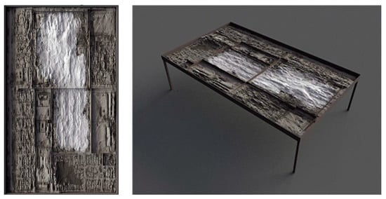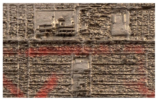The manipulated satellite images of Basrah presented in Virtual Territories neither disclose the artist’s family history nor reveal any trace of the millennia of Jewish life that predated the Islamic settlement of the region. These satellite-mediated views neutralize the history of violence and the trauma of displacement, affording what the artist regards as “analytical distance” (communication with the author on 2 December 2019)—which comes at the cost of masking personal and collective memories. This possibly resonates with the gaps and silences which () describes as essential to the life experience of second-generation refugees. In choosing to resort to Google Earth’s global views, Sharabani sends us into orbit in an inverse spatial movement to Ullman’s digging and transporting bodies of earth. Yet, Sharabani experiments with the possibility of transforming the lost or inaccessible presences into solid surfaces, invoking the ancient Egyptian and Mesopotamian art of bas-relief (communication with the author on 14 October 2019). Presented as if in low relief, the views of Basrah from outer space bring to mind archaeological excavation sites—unearthing the foundations of vanished civilizations.