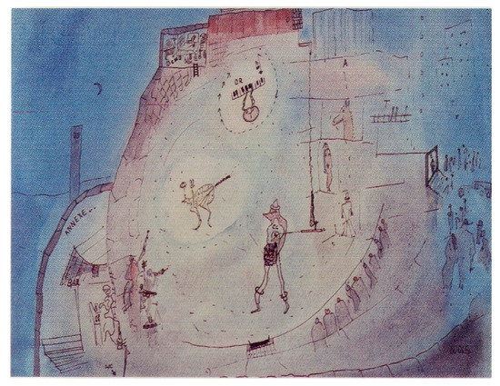 While conceiving Circus Wols, the artist was aware that his life was in danger and that his fate depended upon the uncertain success of an unpredictable sequence of procedures. Varian Fry explained in Surrender on Demand that a mix of rational planning and chance decided the fate of the refugees: an unexpected detail could compromise a carefully prepared departure (Fry 1945, pp. 52–55, 122–29). Recourse to imaginary worlds, inspired by fairy tales, cinema, and the circus, was a means to escape this stifling uncertainty, to project oneself into a more joyful atmosphere. Such subjects were frequently treated in detention camps and according to historian Peter Kuon, they helped the prisoners endure the gravity of the situation and preserve their humanity (Kuon 2008, p. 178).