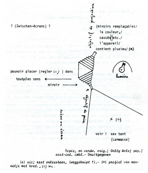 Wols has connected the tiny insect to a rod perpendicular to the torso, marked by the inscription “L” (like light or “lumière” in French; the letter “L” also stand for light in the manuscript Rumba I). In the lap of the zoo-anthropomorphic clown, under the insect, there is a loosely sketched mechanical device from which two dotted lines emerge and progressively diverge to enclose the giant arthropod on the stage. The configuration of the stage, screens, light-source, and mechanical device recalls Wols’s diagram of a “polyscope” also found in the archives (Figure 3; Van Damme 1985a, p. 58). The polyscope consists of a recording lens and a projection lens, associated with movable mirrors and intermediary screens. As it is illustrated in the watercolor, a source of light is necessary for its functioning, as well as a stage and a screen. In another sheet, Wols explains that his invention allows for optical trickery, namely multiplications and amplifications (Van Damme 1985a, p. 57).