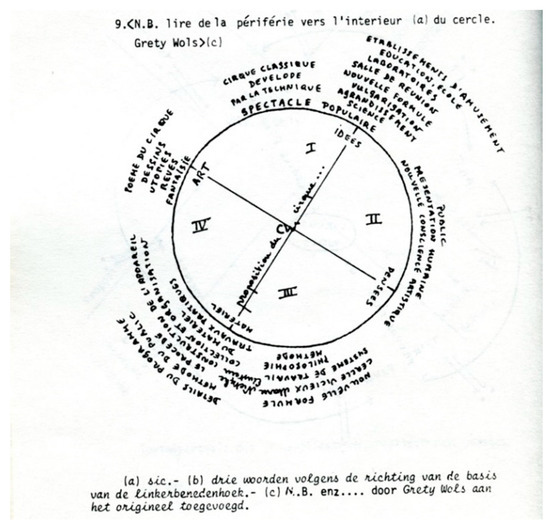While there is both a conceptual and organizational structure to the Circus Wols, its apparent disorder may be at least partly intentional. The artist intended the project as a totalization and democratization of the best of human thought—including the humanities, arts, and science—under the form of a popular spectacle. At the same time, he wished to leave space for the public to adjust and interact freely. He explained that the above-mentioned annotations should enable the public to “travel” from one folder or topic to another (Van Damme 1985a, p. 46). Thus, the arrows, present in the manuscript and drawings, embody his will to “leave the folders, the phenomena, the subjects, etc. continuously in relation between them in all directions” (p. 46). He also refused the hierarchal subsumption of the detail under the whole by designing interactive and open-ended folders in order to “obtain a result either for the ensemble or for the detail” (p. 46).4
