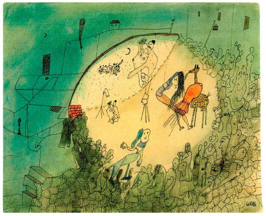 In Circus Wols, the insects are often anthropomorphic, as illustrated in The Circus; Simultaneous View and projection by the figure with the stinger enlacing, and seemingly aspirating, the sleeping man. The long hair and the breasts suggest feminine attributes, although the gender is not clear. In the same drawing, the inscriptions “H” and “I” which appear beside the long-haired figure facing the giraffe, may refer to “homme” and “insect” (human/insect). Another anthropomorphic insect performs at the center of The Circus I Adore, combining, as we have pointed out, the physiological aspects of a flea and a woman.