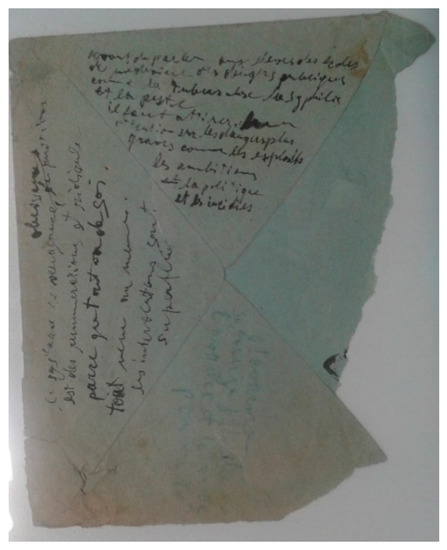 This disillusionment with art is sensible in Wols’s aphorisms as well. Referring to human actions, and implicitly to artistic production, these short texts, which represent a considerable amount of Wols’s writings, negate the possibility of transformative art, and more generally of any grand discourse. The artist’s distrust of grandiloquence grew in proportion to his isolation and misery in Dieulefit, where he was once again threatened as a stateless “apatride” after German troops took control of the Free Zone. One aphorism conceived there testifies explicitly to Wols’s definitive dismissal of great discourses (Figure 7). Here, as in the greater part of the archives, the writing is difficult to decipher and departs in all directions on the page. One of the two inscriptions (on top in our illustration) reads: “Before informing the students at school about the incidence of the public dangers such as tuberculosis, syphilis and plague, we should draw their attention to bigger dangers such as great achievements, ambitions and politics and [unreadable].” (Wols, fund Iliazd 1940–1944, 3878; Slavkova 2018, pp. 341–43).15