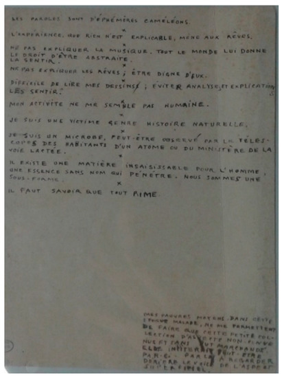 - Slavkova, Iveta. 2004. Circus Wols: Le testament de Wols au camp des Milles. In Les Écrits D’artistes Depuis 1940. Edited by Françoise Levaillant. Caen: IMEC, pp. 145–57. [Google Scholar]