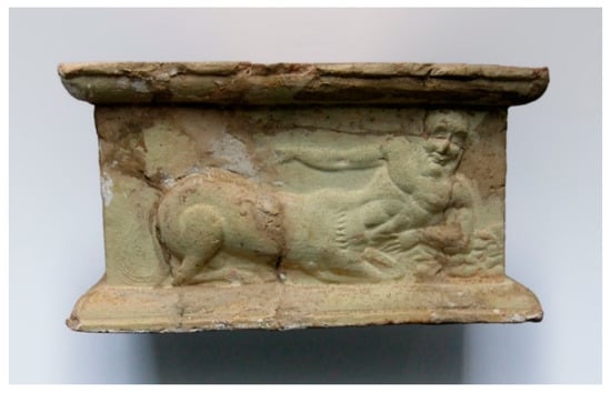 Another mythological being attested in Motya is the centaur—half man, half horse—almost always portrayed as short-tempered, violent, wild, rough and brutal, unable to tolerate wine. The centaur’s main mythic characteristic is to embody all the qualities and all the flaws of the human race, however raised to the extreme. He played diametrically opposing roles, of great wisdom—such as Chiron, tutor of Achilles—or of incredible brutality—such as the participants in the wedding feast of the Lapiths. Indeed, centaurs belong to a special mythological category, because they are not so much hybrids (combinations of composite parts) as “doubles (δίφροί)” of man and horse at one and the same time. As doubles, they share with men some qualities, such as courage and strength and, at least in part, some aristocratic forms of chivalry and sociality. However, the equine fury, the usual drunkenness and violence directed mainly to their wives, banish them from socially acceptable behaviors and reconnect them instead to primitive forms of sexuality and to the world they lived in the wild and mountainous slopes of Mt. Pelion in Thessaly. The figure of the centaur, like the sphinx, is thus formed of a human element dominating an animal part and symbolizes, from the psychological point of view, the merging in one individual of two opposing trends: the strength of the spirit of wisdom, and the rush of instincts as underlined in the Mediaeval Liber Monstrorum (ca. 700 ce): “Centaurs have a shaggy head, to some extent very similar to a human one, with which they can start talking: but their lips, unfit for human speech, cannot organize any sound in words” (1.7).