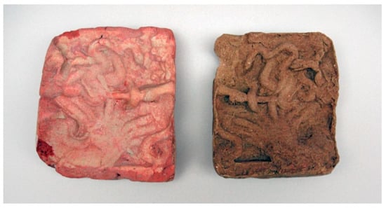 Two demon heads with horns and a lion’s snout are probably associated, however distantly, with Near-Eastern iconography. Nonetheless, the scene in which they are depicted—a partially preserved coroplastic mold—is evidently connected with Greek myth and iconography, as it portrays the second Labor of Heracles, the killing of the Lernaean Hydra (Figure 6).41 The latter monster, whose lair was the swamp of Lerna in Argolis, has the form of a large snake equipped with a single viper’s tail and multiple heads, of which only one was immortal. The monster was so poisonous that its breath and even its smell could kill. The heads could also regenerate when cut, so the only way to make it harmless was to cauterize the neck immediately after beheading it.42 The oldest images of the Hydra date from the end of Orientalizing period and are probably related to remote oriental figures in which a human fights and kills snake-tailed monsters.43 The monster only appears in scenes referring to its death at the hands of Heracles. In connection with the Hydra and Pholus (mentioned earlier), it is interesting to note that the episodes of the Labors of Heracles occur frequently among the artifacts of Motya—evidence of the hero’s great local popularity; a hero who shared many similar aspects with the Phoenician Melqart.