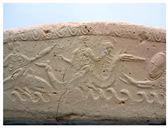 At Motya pistrices are found in a less violent scene on the rim of a louterion, as mounts for the Nereids, who carry weapons to a hero (Figure 7). This scene must be understood as a reference to the story of the armor of Achilles, for indeed it was the Nereid who delivered the weapons sent by his mother Thetis.49 The most famous depiction of a pistrix is the one preserved in the Archaeological Museum of Naples, in a group of sculptures, dating to the 1st century bce, from Vedio Pollio’s Villa in Posillipo, in which the pistrix is similarly used as a mount by a Nereid.