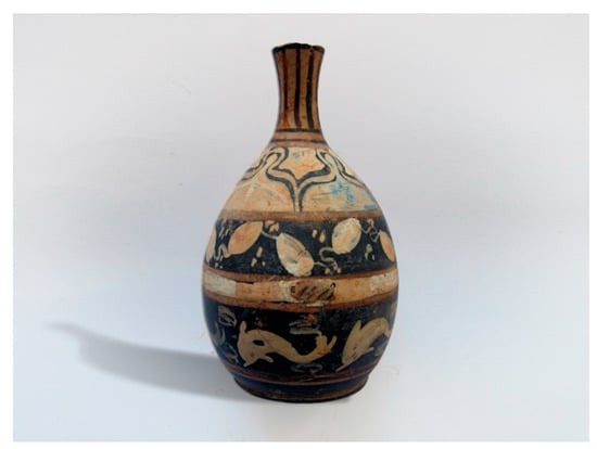 On the rim of the same louterion we also find dolphins together with the pistrices and Nereids. On the rim of another Roman marble louterion these marine mammals are shown in pairs while jumping out of the waves50; and on a bottle made in the workshops on the island of Lipari in the first half of the 3rd century bce (Figure 8)—probably a cosmetics container, as a yellow powder inside proved to be goethite, a mineral used in ancient times for eyeshadow.51 In ancient myth, the dolphin was always considered a friendly animal, often the savior of sailors and castaways, as in the myth of Arion or the foundation of Delphi, named in honor of a dolphin.52 It was also believed that the souls of drowned sailors would return to live in the form of a dolphin, regaining possession of that vital force that the sea had taken from them.53 Their connection with Dionysus is well-known (Hom. Hymn 7)—starting with the tale of the Tyrrhenian pirates; the association with wine consumption and the sea world is illustrated by the mammals (many of them as musicians) painted on cups, kraters, dinoi and other sympotic vases, as well as by the representations of maenads holding fish, from the Archaic period onwards. A terracotta dolphin was among the votives of the 15th century BCE sanctuary at Aya Irini on Keos, offered to a god generally recognized as Dionysus.54