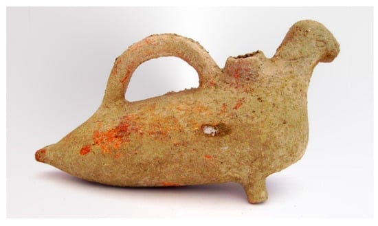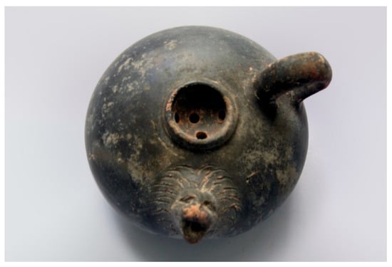 The oldest depiction of a sphinx found in Motya is on an alabastron (a small container for ointments, unguents, or cosmetic powders), of Corinthian production, dating to the late 7th century bce.21 A very humanized creature, wearing earrings and a fashionable headdress, the sakkos (a kind of cap to gather her hair) is depicted on the lid of a red-figure guttus (a small spouted libation vessel) dated to the late 5th century bce (Figure 3). Sphinxes are depicted on small domestic altars, the arulae, found in limestone or pottery, dating between the 5th and 4th century bce, as well as on architectural reliefs, pointing to a religious, apotropaic function (Figure 2, above).22