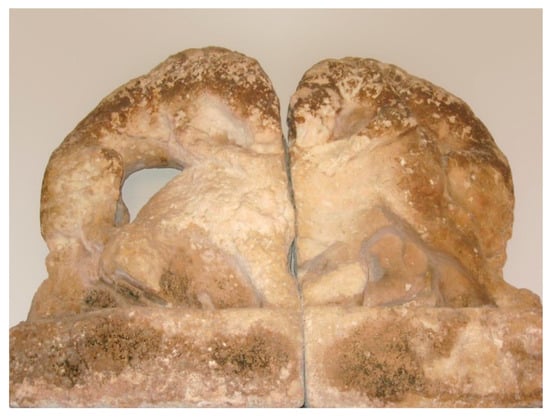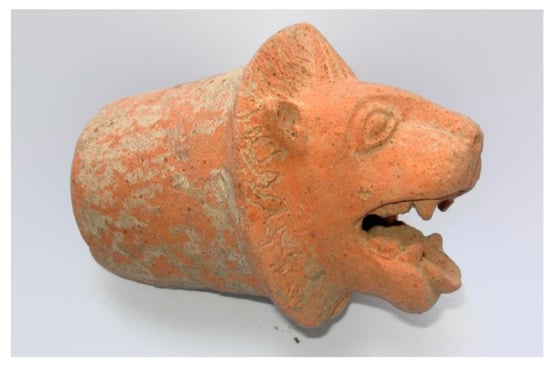 A small number of lion-headed protomes, of different size, material and dating, share the common purpose as water pipes. One life-size gargoyle was found in Motya “in the ruins of buildings”; it is made of tufa limestone and dates to the second quarter of the 5th century bce; it is doubtless of Greek manufacture, probably from Agrigento, Sicily.81 One terracotta example still retains part of the cylindrical tube (Figure 20). It should be understood as a water conduit for a fountain, as it is often found on scenes of Attic pottery. Usually this type of object is made of metal, but there are also some examples of terracotta.82 A feline is probably depicted in a small hollow sculpture; terracotta paws, originally from Lilybaeum, are likely feline; just as bull’s heads, lion’s heads could also be represented on Hellenistic braziers; great cats are depicted, too, in a panel of the House of the Mosaics; and one group shows lions attacking a bull.83 A small limestone sculpture, dating to the 6th–5th century bce, found in Motya, shows two seated lions flanking an enthroned, headless female figure, undoubtedly Cybele, the Anatolian Mother Goddess, Mistress of Animals (Figure 21).84