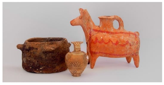 Container in the shape of cow (MGW inv. no. 4386) together with two other vessels; ceramic vessel; ca. 6th century bce.